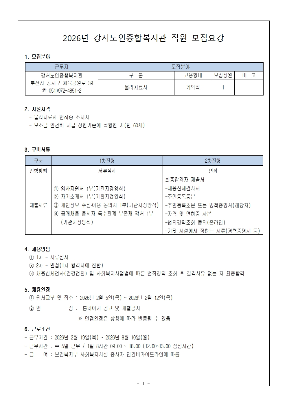 [채용-긴급] 강서노인종합복지관 2026년 물리치료사 공개 채용