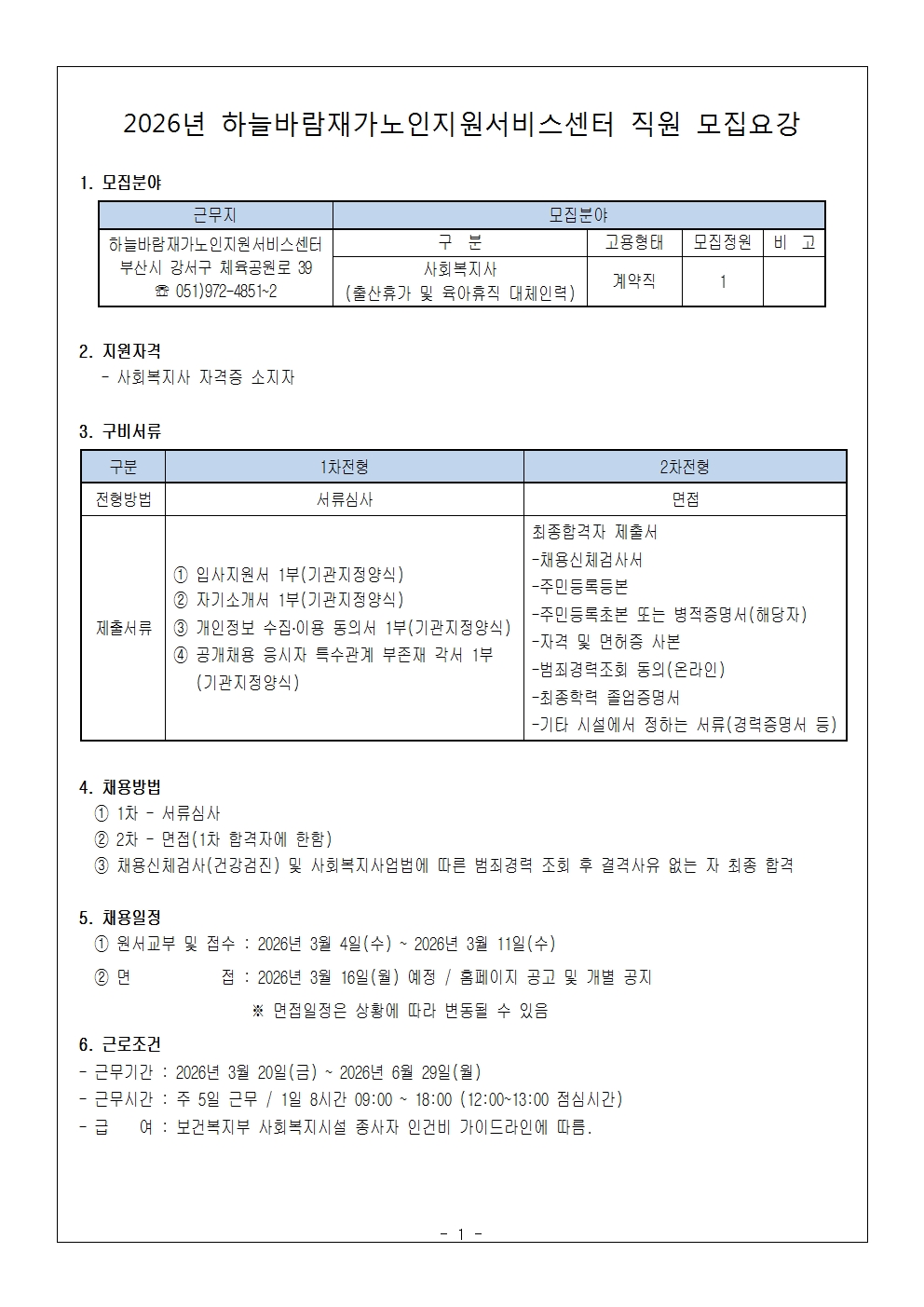 [채용-긴급 2차] 하늘바람재가노인지원서비스센터 2026년 사회복지사(대체인력) 공개채용