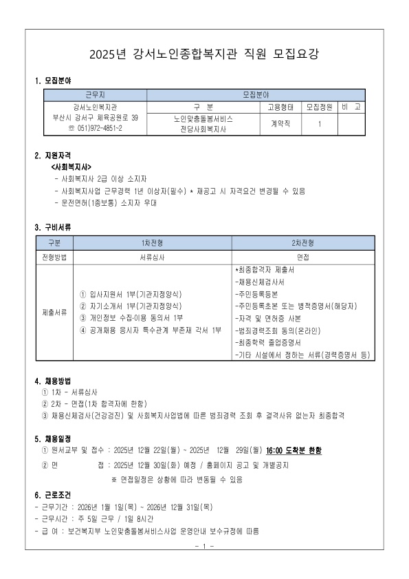 [채용] 강서노인종합복지관 노인맞춤돌봄서비스 전담사회복지사 채용 공고 (긴급)