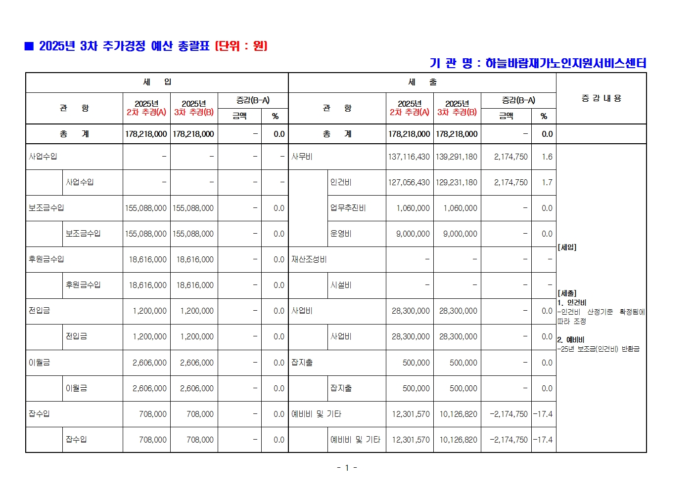 제목 하늘바람재가노인지원서비스센터 2025년 3차 추경 예산 공고