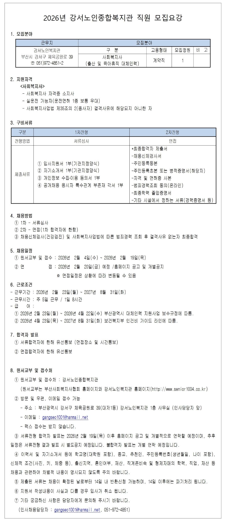 [채용] 강서노인종합복지관 2026년 출산 및 육아휴직 대체인력 사회복지사 채용 공고