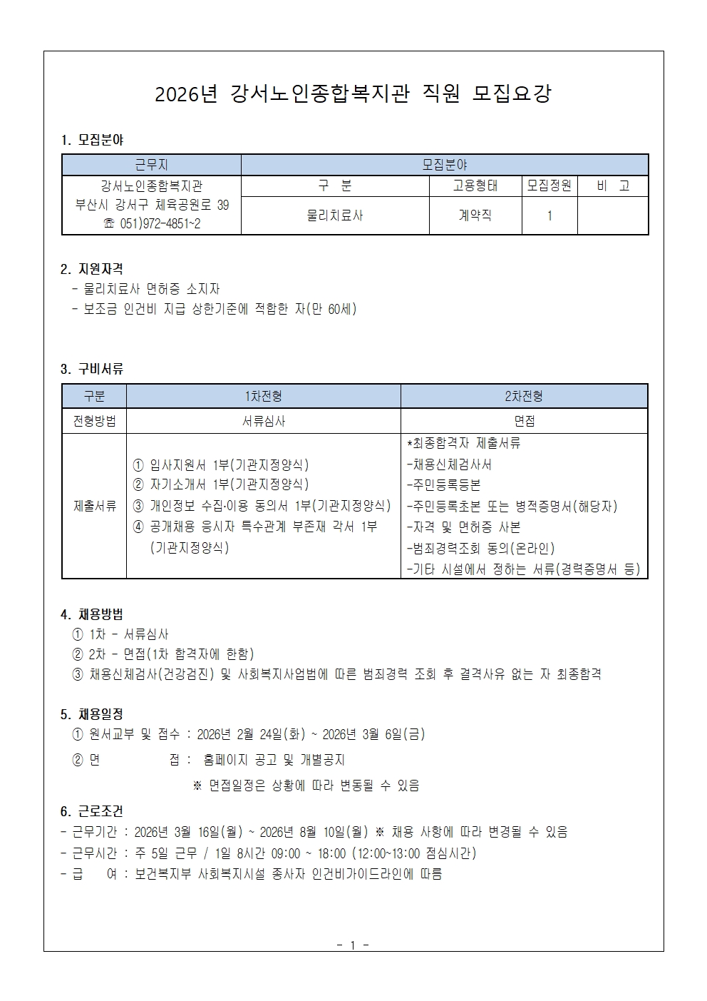 [채용-긴급 3차] 강서노인종합복지관 2026년 물리치료사 공개 채용